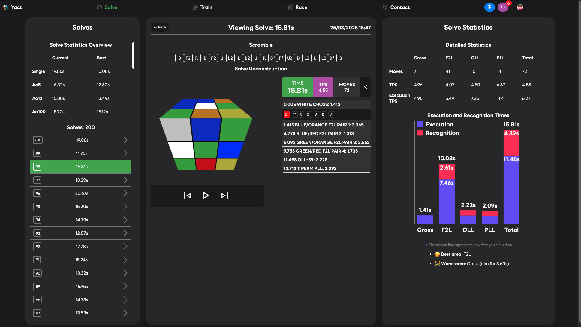 Auto-split every solve to track execution, recognition, TPS, and move count across Cross, F2L, OLL, PLL, and Total. Leverage fuzzy heuristics to pinpoint exactly what to practice next.